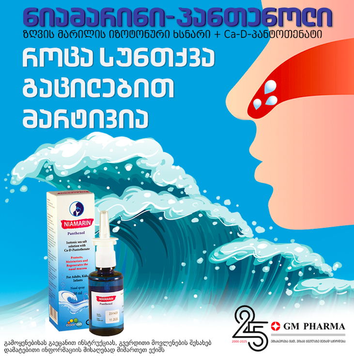 ამ საჭიროებას ზუსტად პასუხობს ორმაგი მოქმედების ნიამარინი-პანთენოლი ცხვირის სპრეი, რომელიც არის ზღვის მარილის იზოტონური ხსნარისა და პანთენოლის უნიკალური კომბინაცია.