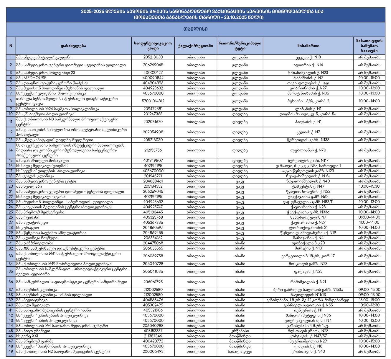 ქვეყნის მასშტაბით გრიპის საწინააღმდეგო უფასო ვაქცინაცია გრძელდება. სერვისი ხელმისაწვდომია შემდეგ დაწესებულებებში: