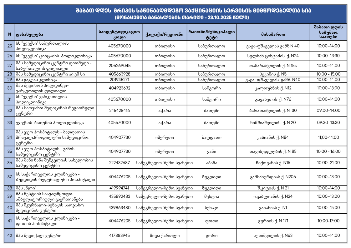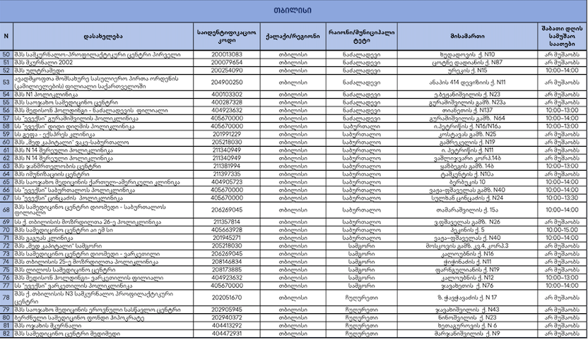 მაღალი აქტივობის გამო, მათთვის ვინც ვერ ახერხებს სამუშაო დღეებში ვაქცინაციას, შეგიძლიათ მიმართოთ შაბათობით შემდეგ დაწესებულებებს მითითებულ საათებში: